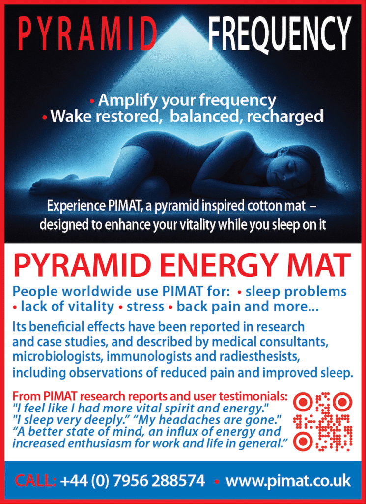 Then, in July 1993, I heard of PIMAT.. Following the instructions, I put it in my bed, under my sheet and slept on it. It worked on my aura, rebalancing the colours and restoring my energy while I slept. It worked like magic, using very ancient knowledge – of the energy of shape-or neoenergy.